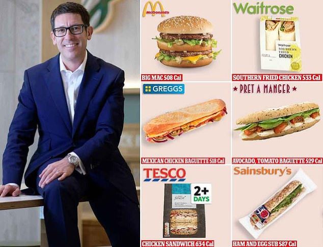 Dia pun mengurai tentang hidangan cepat saji saingan restonya yang kalorinya lebih banyak ketimbang Big Mac (kiri atas) termasuk ayam goreng dari Waitrose (kanan atas), ayam panggang dan sandwich sosis dari Tesco (tengah atas), ham asap dan sub freerange dari Sainsbury (kiri bawah).