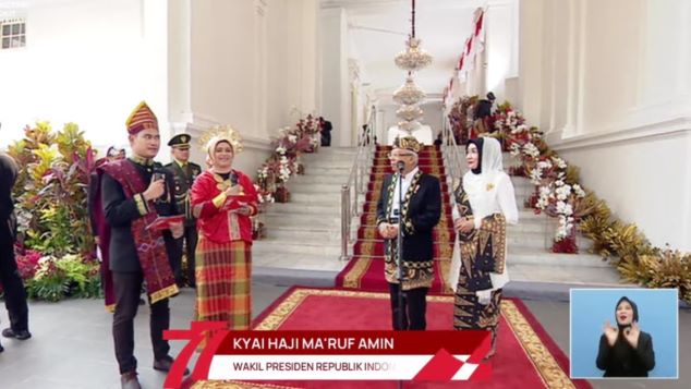 Pada upacara tersebut, Wapres mengenakan busana adat dari Provinsi Banten. Sementara itu, Ibu Wury tampak anggun memakai kebaya berwarna putih dibalut selendang berwarna hitam dengan motif emas.